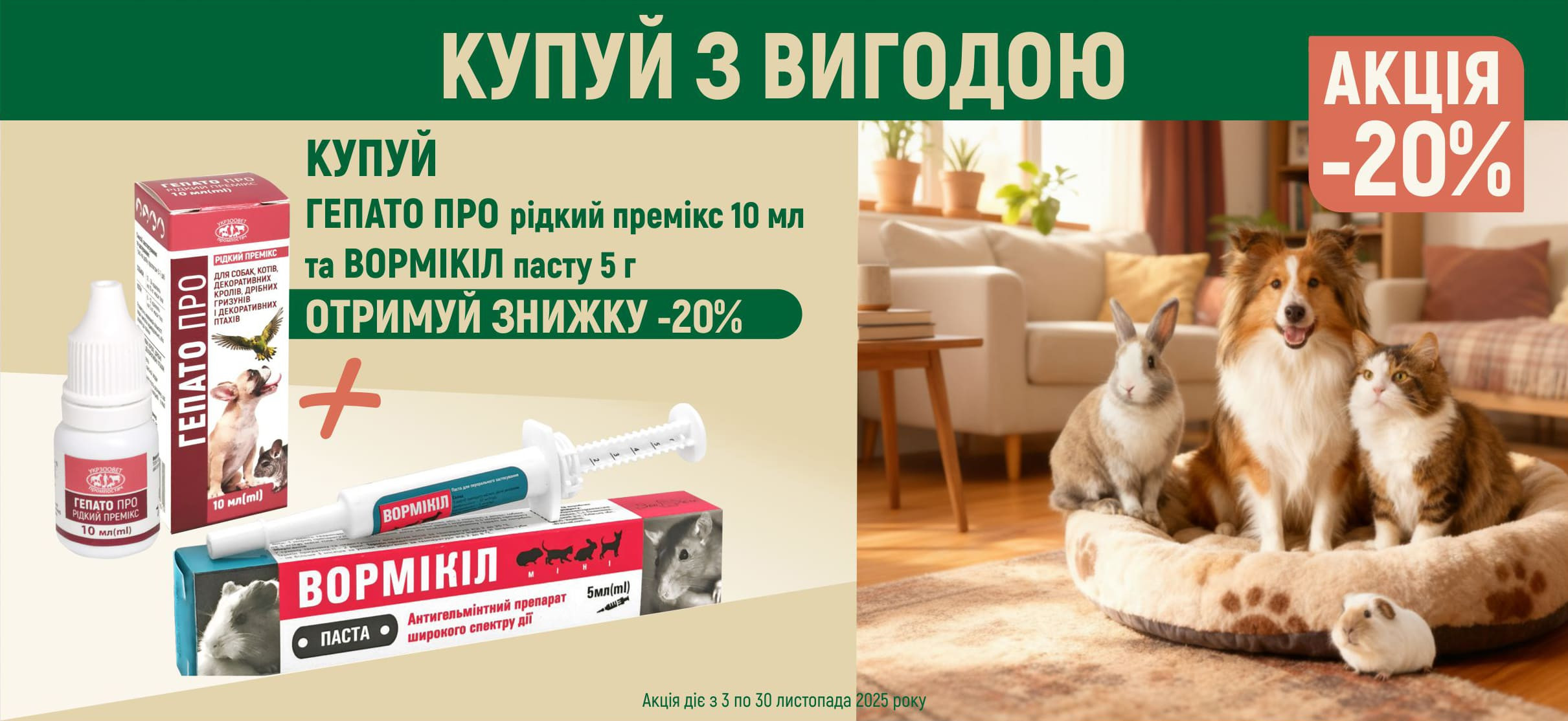 3 акции = 3 выгоды с 24.11.2025 по 30.11.2025 (Акция действует при условии наличия товаров на складе). Улучшайте здоровье животных с выгодой! Выбирайте проверенные ветеринарные препараты и средства ухода со...