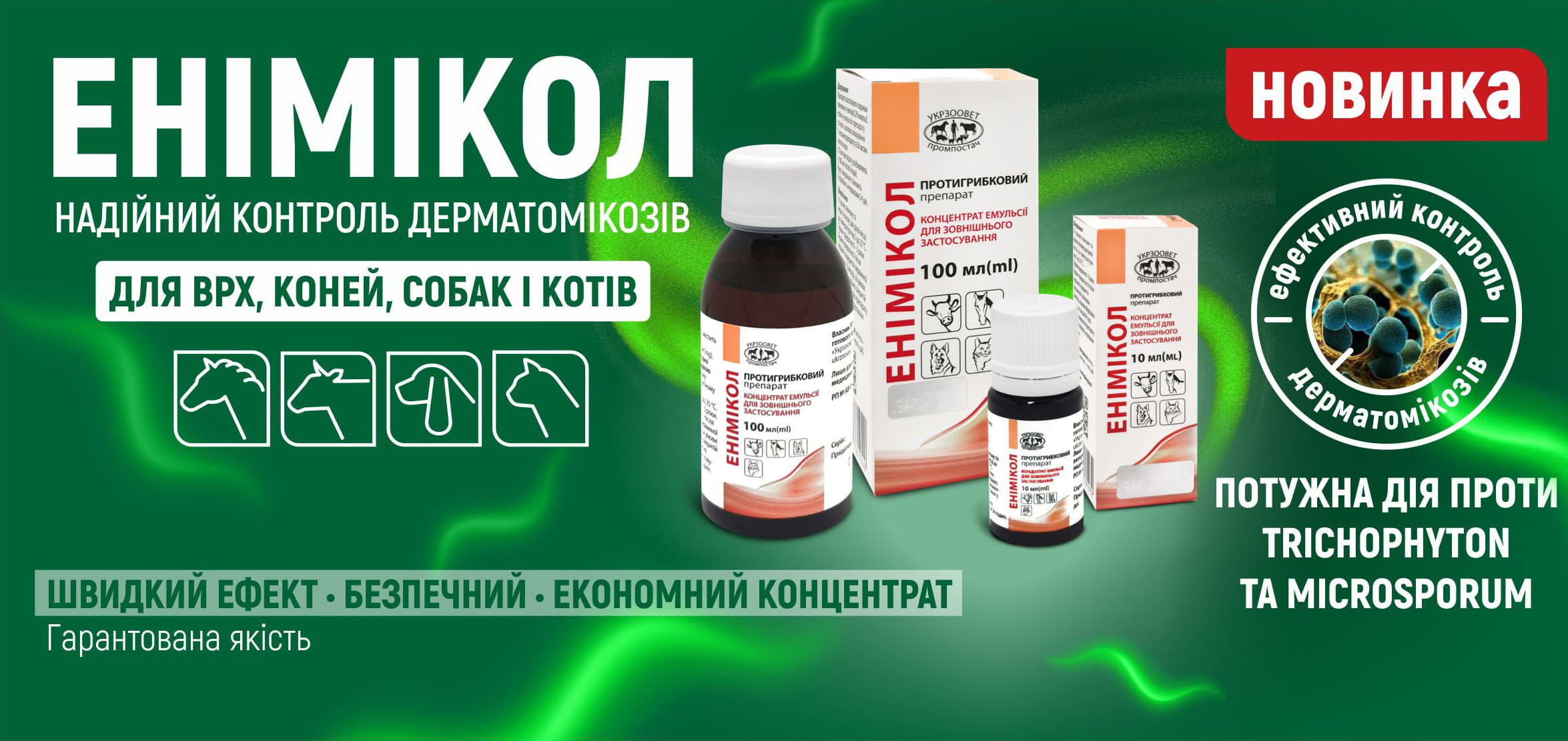 ЭНИМИКОЛ – надежная защита от дерматомикозов. Новинка в линейке дерматологических противогрибковых средств от УКРЗООВЕТпромпостач – препарат ЭНИМИКОЛ, концентрат эмульсии для наружного применения. Эффективный • Безопасный • Быстрый результат 🐾